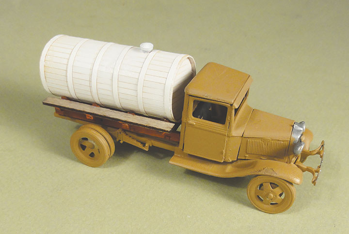 www.berkshirevalleymodels.com has a new kit of an O scale 1934 Ford truck with a wood tank for $27.95. The Ford is the same kit used in other Berkshire truck kits and consists of white metal castings that have to be ACC’d together. Be sure the parts fit, and use the ACC sparingly. I also found the Zip Kicker useful on some of the smaller parts. Written instructions with an exploded view of the truck are included, along with several photos of a completed truck. The wood tank has three laser-cut discs held together with laser-cut strips. Then a scribed wrapper is glued around the discs. I had no trouble doing this. The kit includes some thread for tank hoops, but I decided to use paper strips. I found them easier. There is also a cast metal filler lid for the tank, and a little faucet for the rear of the tank. No lettering is provided. This is yet another of Berkshire Valley’s excellent line of O scale wagon and truck kits. I look forward to more. Bob Brown.
