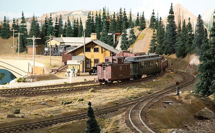 The first siding was located on the lower part of the grade with space provided at the upper end of the siding for modeling of the east end of Cresco siding with its phone booth, station sign, wood pile trestle and water tank. Cumbres would be at the top of the 3.8 percent grade, but the trackage did not fit. Cumbres became Carrumba with a long passing siding, a spur, a wye tied into the siding and structures from Cumbres. Fritz Park is the named place of a third siding and a spur located between Durlin and Carrumba. It is the real top of the hill as the main climbs on a 1.5 percent grade out of Carrumba and then descends on a 4 percent grade from Fritz Park to Durlin. The fourth passing siding is Navajo on the lower deck between Chama and Durango staging. The east end of Navajo is visible and includes the station sign, car body shed, water tank, pump house and pin-connected through truss bridge.