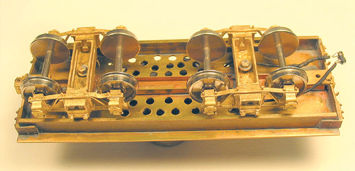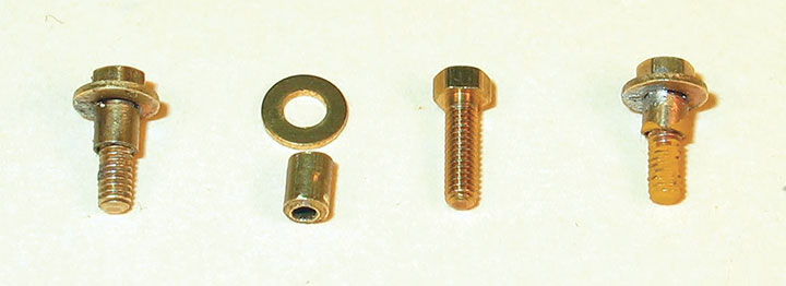Still keeping things simple on the underframe, I turned short lengths of brass rod to act as bolsters. I drilled and tapped them for 1-72 screws, and then made my own shouldered screws to hold the trucks in place. This type of screw can be difficult to find, but making them is fairly simple, as shown in the photo. I’ve also used this method to make driver crankpin screws, which are also hard to find commercially. This is a perfect place to use solder paste.