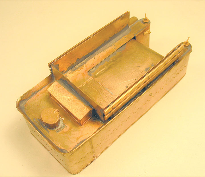 After the shell was complete, I fabricated brass sheet to cover the coal bunker area. This forms a box which encloses the speaker for better sound quality. This makes it difficult to add a coal load later, but the noticeable difference in sound quality is worth it.