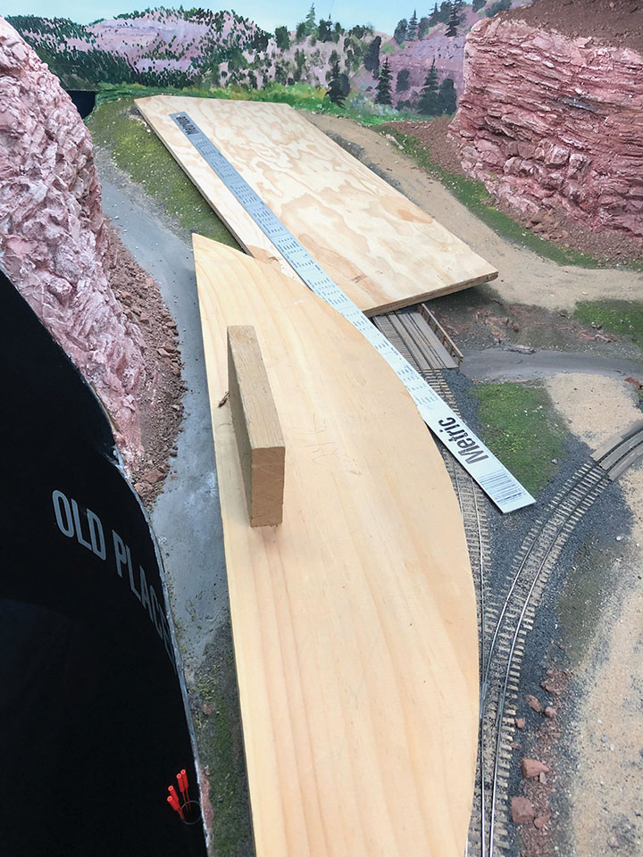 I cut a piece of plywood roughly the size of the area where all the buildings would fit while leaving room for the spur track. Installing the spur track at the workbench would be the way to go. This part of my layout is so deep that I can’t reach the very back of the scene, let alone hand lay track back there. In this photo, I’m using the meter stick to visualize the center line of the spur track. The wooden block in the photo has a 24-inch curve cut into it. I used this gauge to plan my layout long before the advent of “sweeps” for simulating radii. Nearly all my curves have a 24-inch radius or greater curve. With the gauge and ruler in place, I could see where I needed to re-construct the scenery and track.