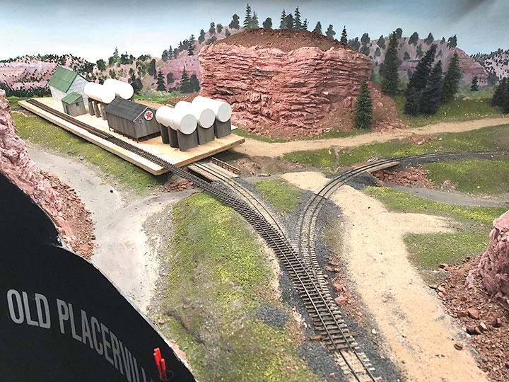 With the basic structures built, I wanted to see how they would fit on the existing Old Placerville vspur on my layout. I didn’t bother with the tanks, but set the other structures in place while leaving room for the tanks. I wanted to get a sense for how everything would fit into the scene, verify the elevations, and see if I could utilize the existing spur trackage. It was apparent that space was going to be tight, and the spur would need to be moved to make room for all the buildings.