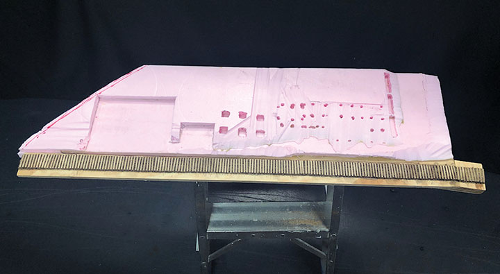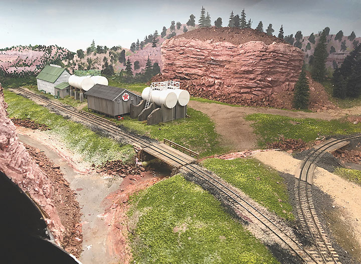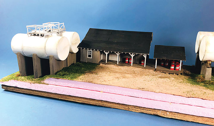 I used ½-inch foam to create contours under and around the structures and tanks and used a foam hot cutter to contour the land, cut in the areas where the buildings were set into the hillside and add holes for the foundations to find level ground. You can also see that I’ve added ties for the future spur track.