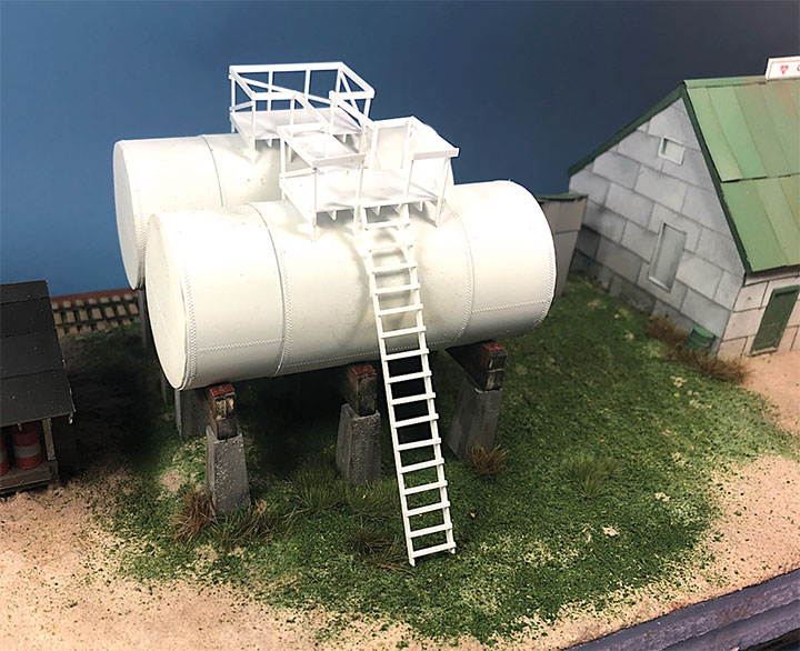 I added sanded grout and ground foam to the scenery base after setting the buildings into their final position. Once the tanks were fully glued to the diorama base and being careful not to get glue on the tanks, I built the tank walkways in place. These walkways and ladders were built using various sizes of Evergreen Styrene.