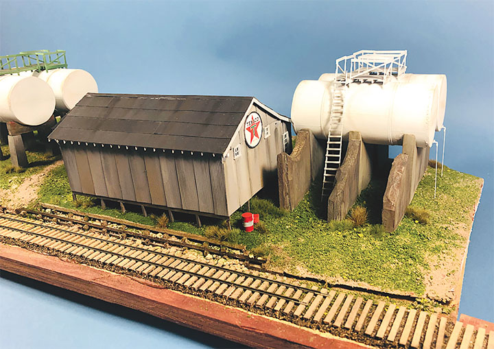 This is the trackside view of the Texaco distributor set into the diorama base. The tank walkways have been built out of styrene, painted Floquil Reefer White and set in place. Precision Scale #2935 Valves and .020-inch wire have been added to the ends.