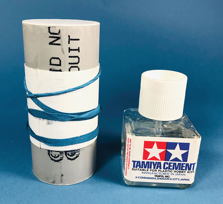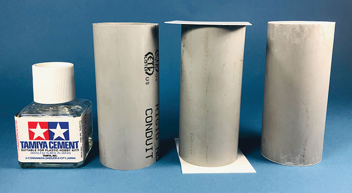 Initially I tried making the tanks using a styrene sheet wrapped around styrene disks, but all I managed to accomplish was to create a badly dented tank that looked like it was being crushed in a junk yard. That failure sent me back to the drawing board. After some thought, I took a trip to the local home improvement store and bought a length of 1¼-inch diameter plastic conduit. The outer diameter worked out almost perfectly to the 12 feet indicated on the Mike Blazek drawings (www.blazekplan.com) that I was using as a guide. I cut five pieces of conduit to 27 scale feet in length, then capped the ends with .020-inch styrene. I used Tamiya cement which seemed to work just fine with the plastic that the conduit was made from. The caps were trimmed to size and filed to create a smooth union. This photo illustrates the steps involved.