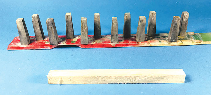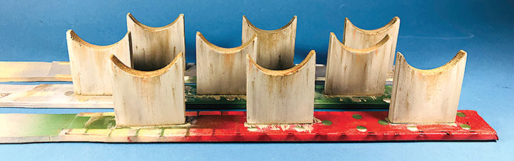 The three Texaco tanks sat on top of poured concrete saddles. I used 5/16-inch plywood to simulate these saddles. The first step was to cut the plywood into strips that were a scale 12-feet wide. I then drilled 1 5/8-inch holes about three real inches apart. Then I cut through the middle of each hole creating a bunch of blocks of wood with a half a circle cut out of each end. These were then used to create saddles ten scale feet in height. When I was done, I had a pile of concrete saddle forms. I selected the best-looking ones and grouped them in sets of three saddles for each of the three Texaco tanks. The wood was then sanded smooth, and I ended up with basic forms that were used to simulate the real concrete saddles.