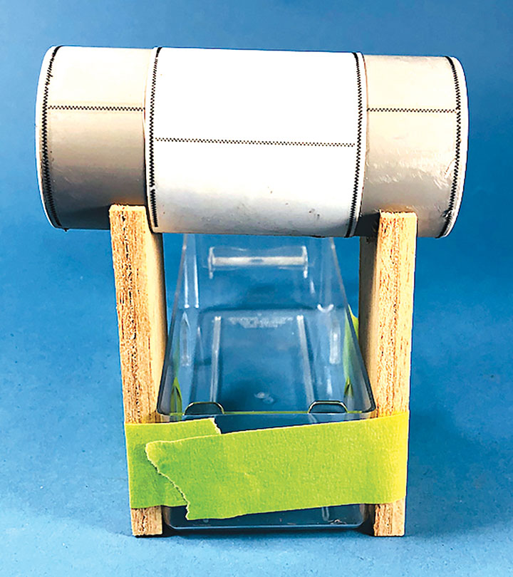 Most prototype tanks constructed in the early 1900s were made by riveting a number of rolled steel sheets together. To simulate the center section of sheets I wrapped a 13½-scale-foot wide piece of .010-inch styrene around the tanks. More Tamiya glue and rubber bands held the styrene in place.