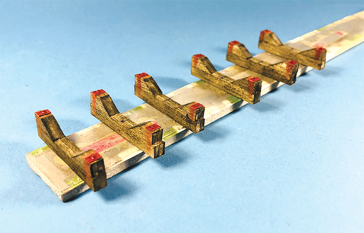 The prototype photos only show the Conoco concrete tank pedestals but don’t show any details of what the tanks sat on. Since there is no sign of steel bracing in the photos, I felt that there was probably some sort of wooden frame between the pedestals and the tank. Using 8- x 16-inch scale lumber, I created large cradles like what you’d see on a Conoco tank car. These cradles were stained with Hunterline Driftwood and Medium Brown stain. On the prototype, the cradles would have needed to be fastened to the pedestals. To simulate that, I made metal plates using 1- x 10-inch styrene with Grandt Line #5123 NBW castings to make it appear like the cradles are lag bolted to the tops of the concrete pedestals. I weathered these cradles with rust colored Pan Pastels.
